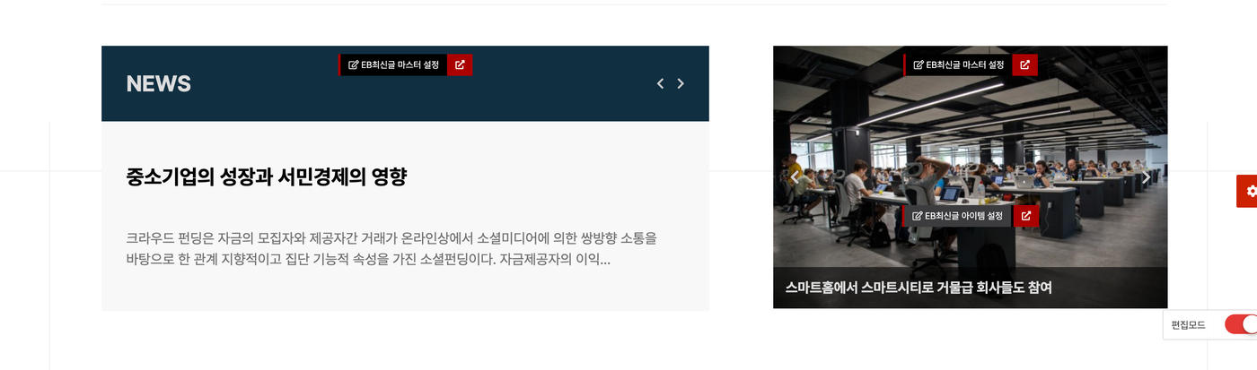 - 메인과 서브페이지에서 편집모드를 통해 손쉽게 내용 및 이미지 수정이 가능합니다.